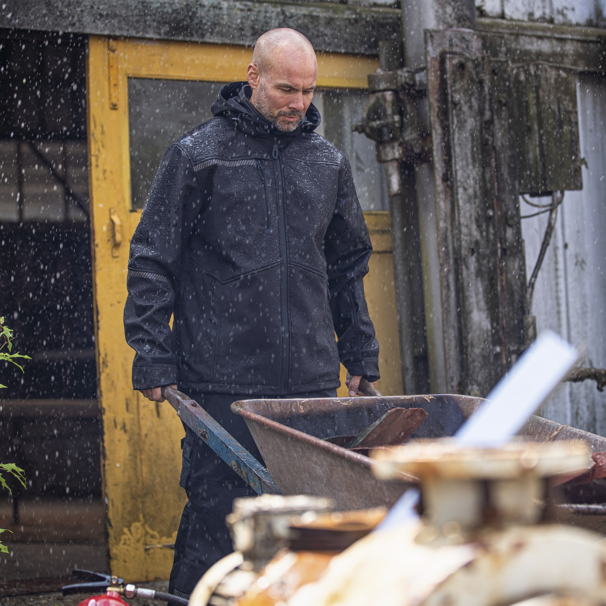 - Justerbar aftagelig hætte med gribebånd på bagsiden